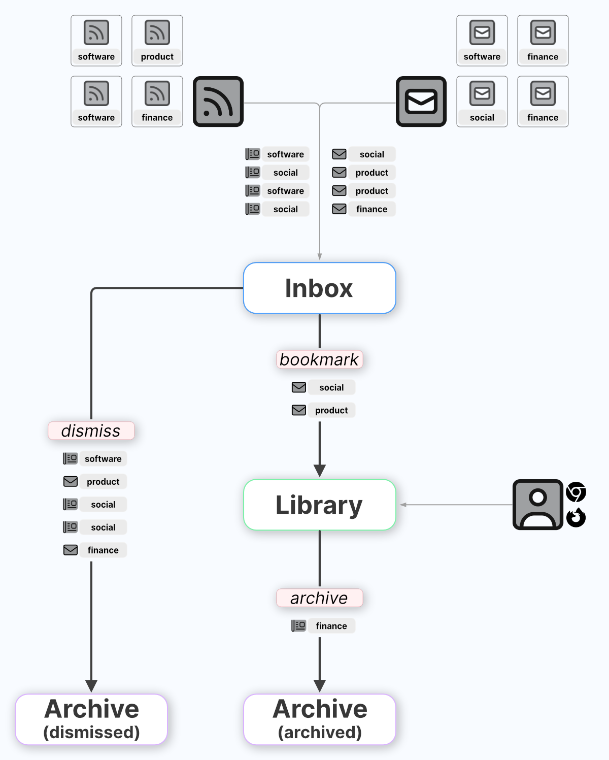 New articles are put in the inbox. There you review to either bookmark or dismiss them. This yes/no decision can be done very quickly.