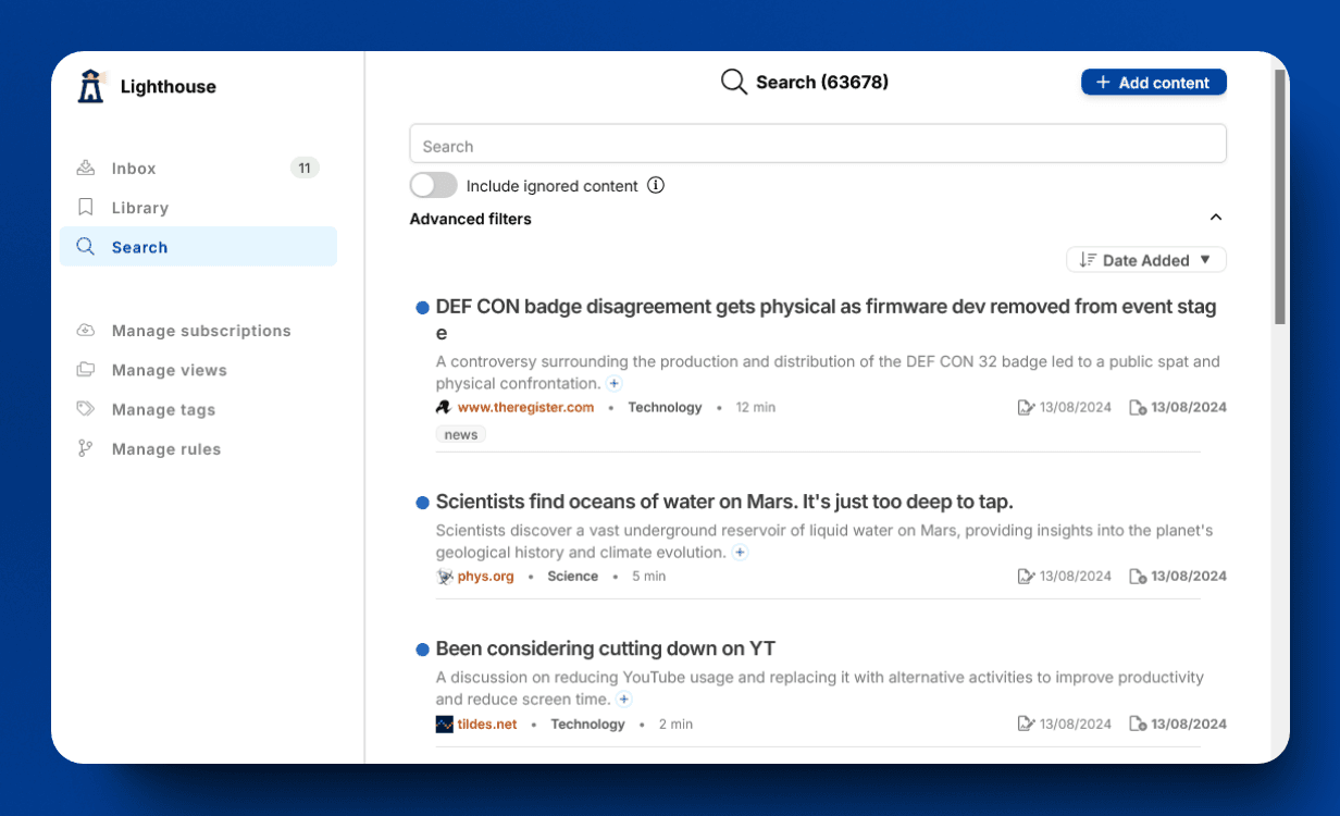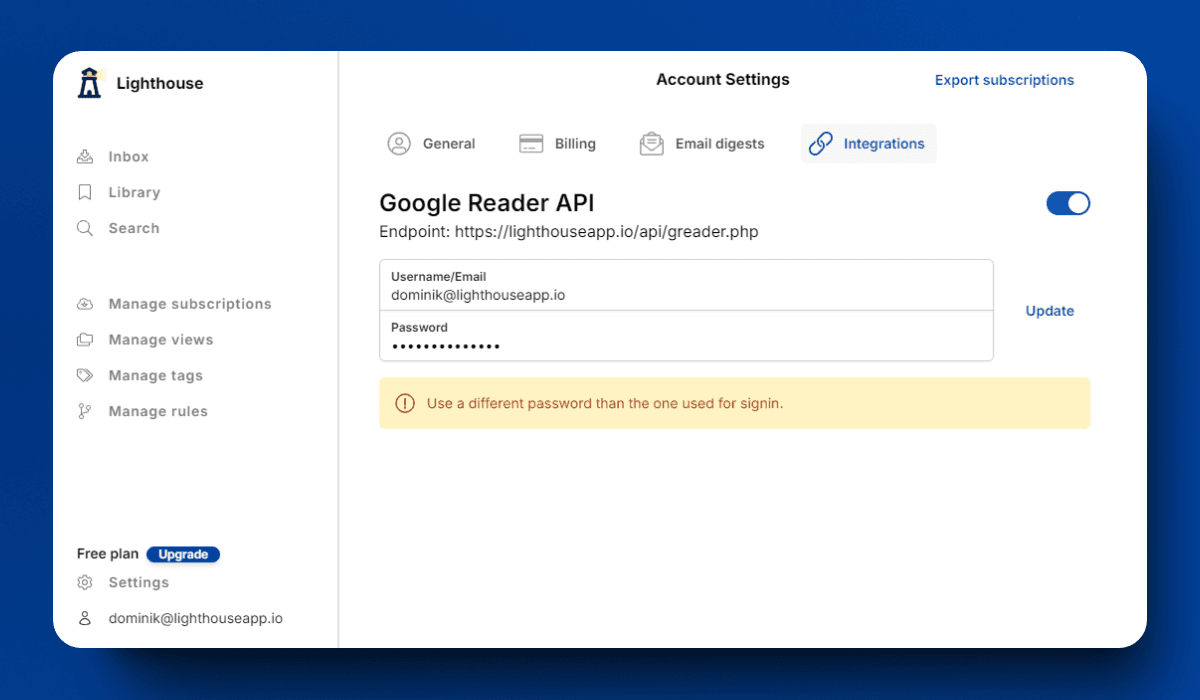 The Google Reader API is a specification that is implemented by many products in the feed reader space. With this API many existing products, for example mobile readers like Reeder 5 or Fiery Feeds, can connect to and show content stored in Lighthouse.