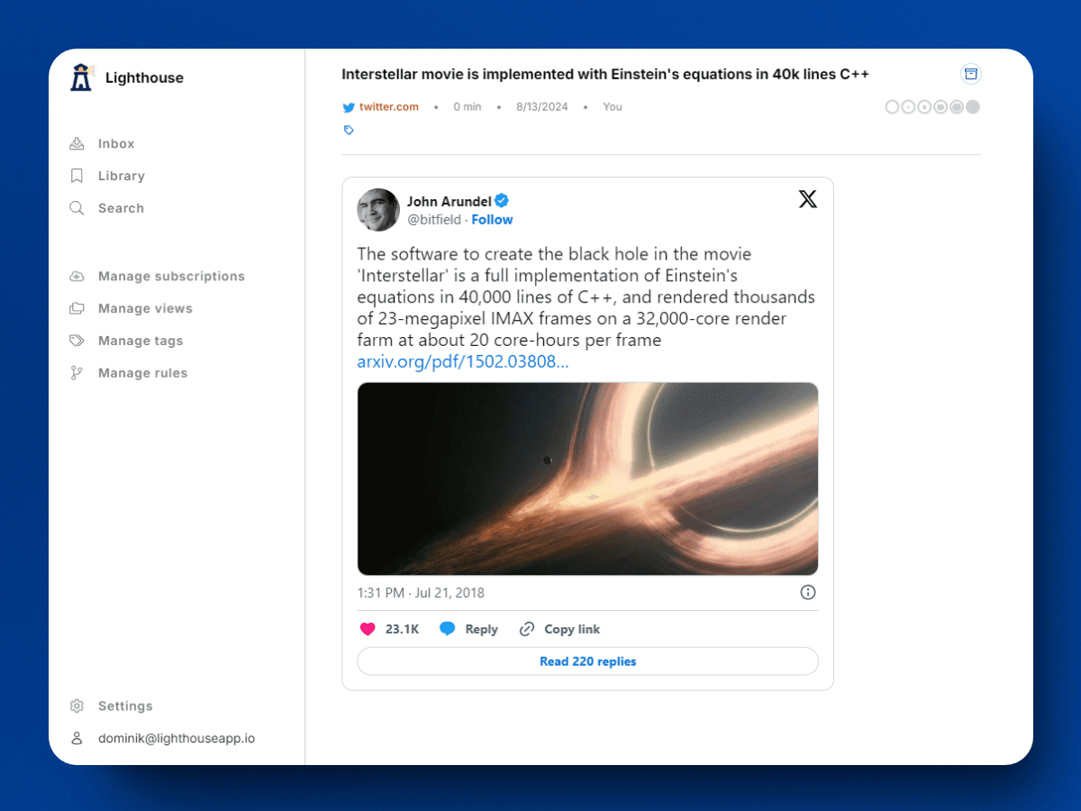 - UI fix: The inbox count in the sidebar updated a couple seconds after archiving or bookmarking items, this is now immediate.