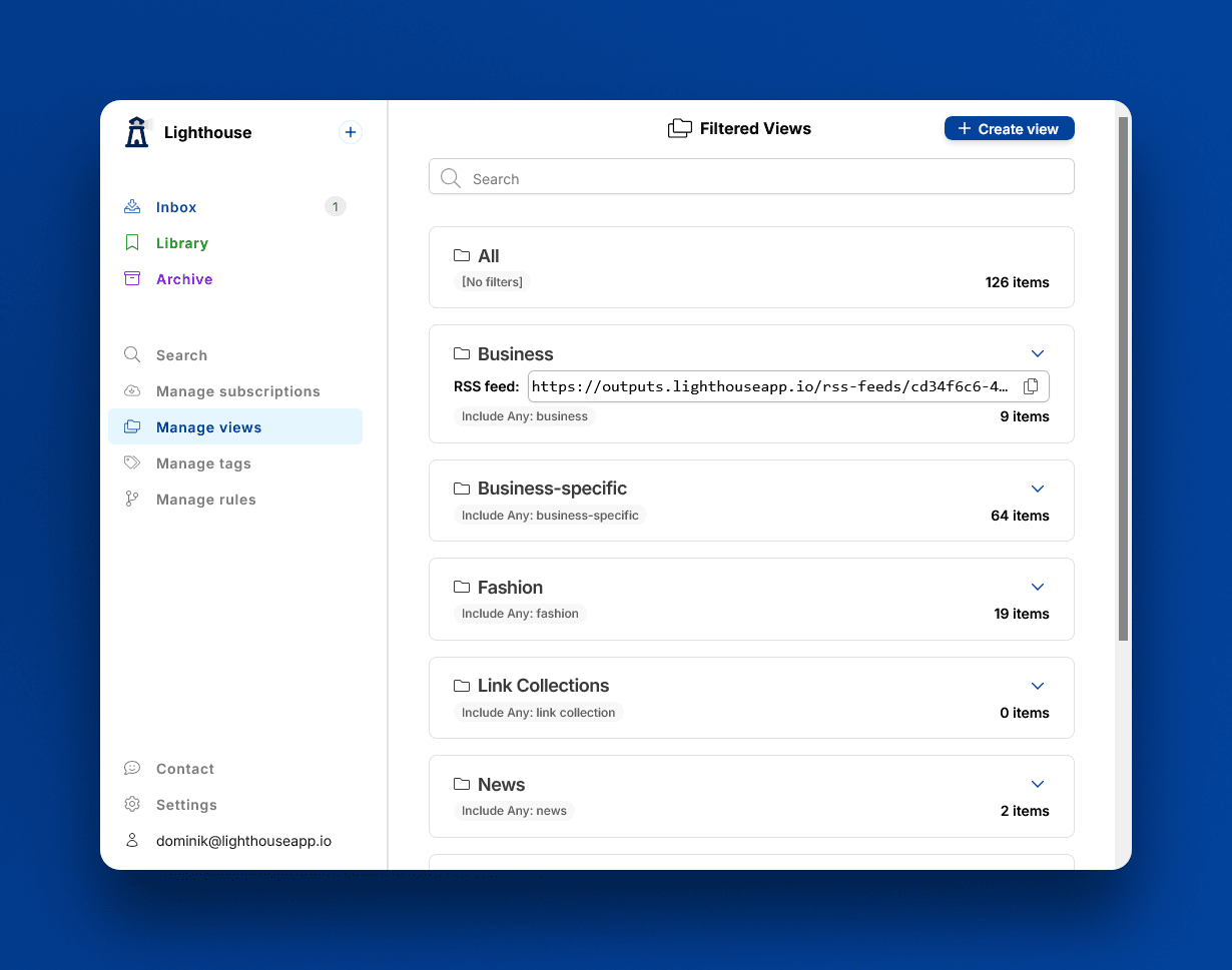 The inbox lets you curate content, so that only the content you find interesting lands in the library. And with views you can organize your library even further. They're basically a filter on the content in your library, so that you see only what you currently want to.