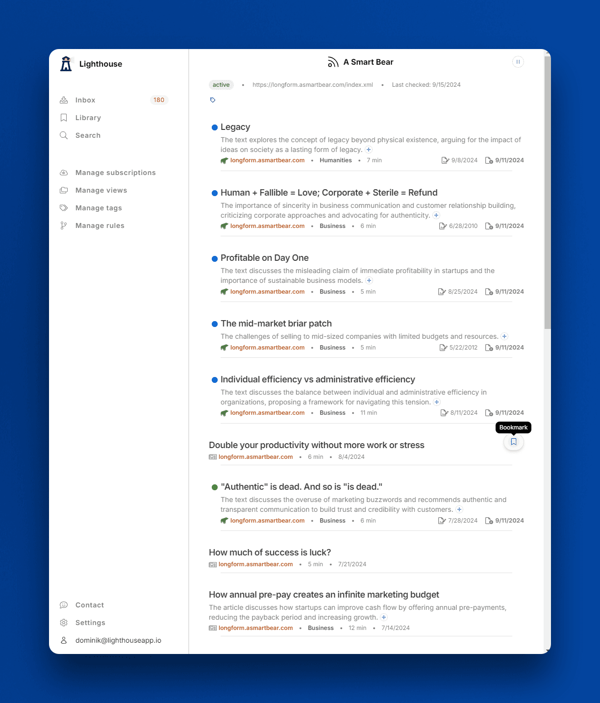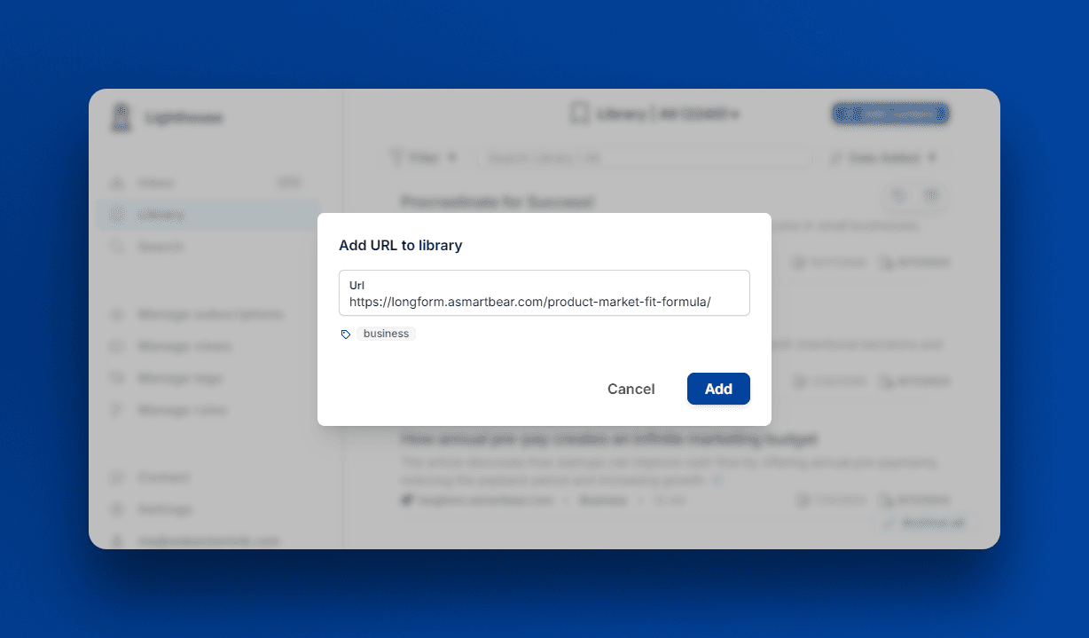 Now you can explore all articles Lighthouse has ever processed. And with the click of a button you can add them to the library.