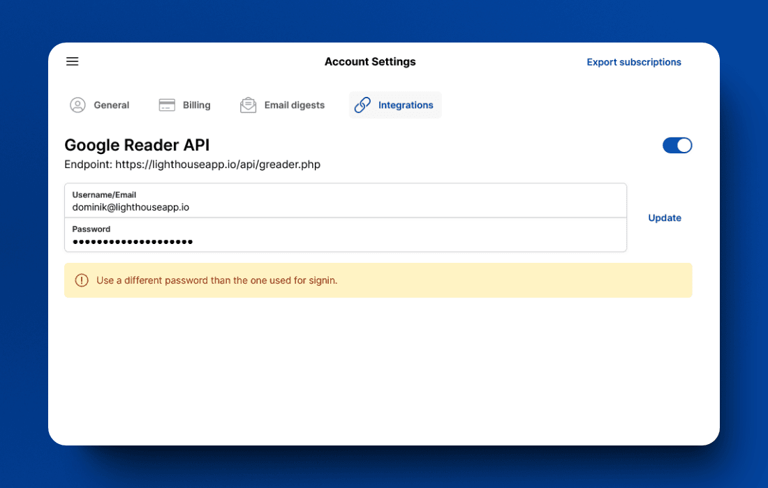 First, go to Settings->Integrations and enable the Google Reader API there. Then set a password. Be careful to use a different one than the one for your Lighthouse account.