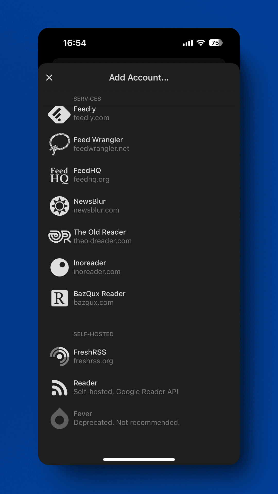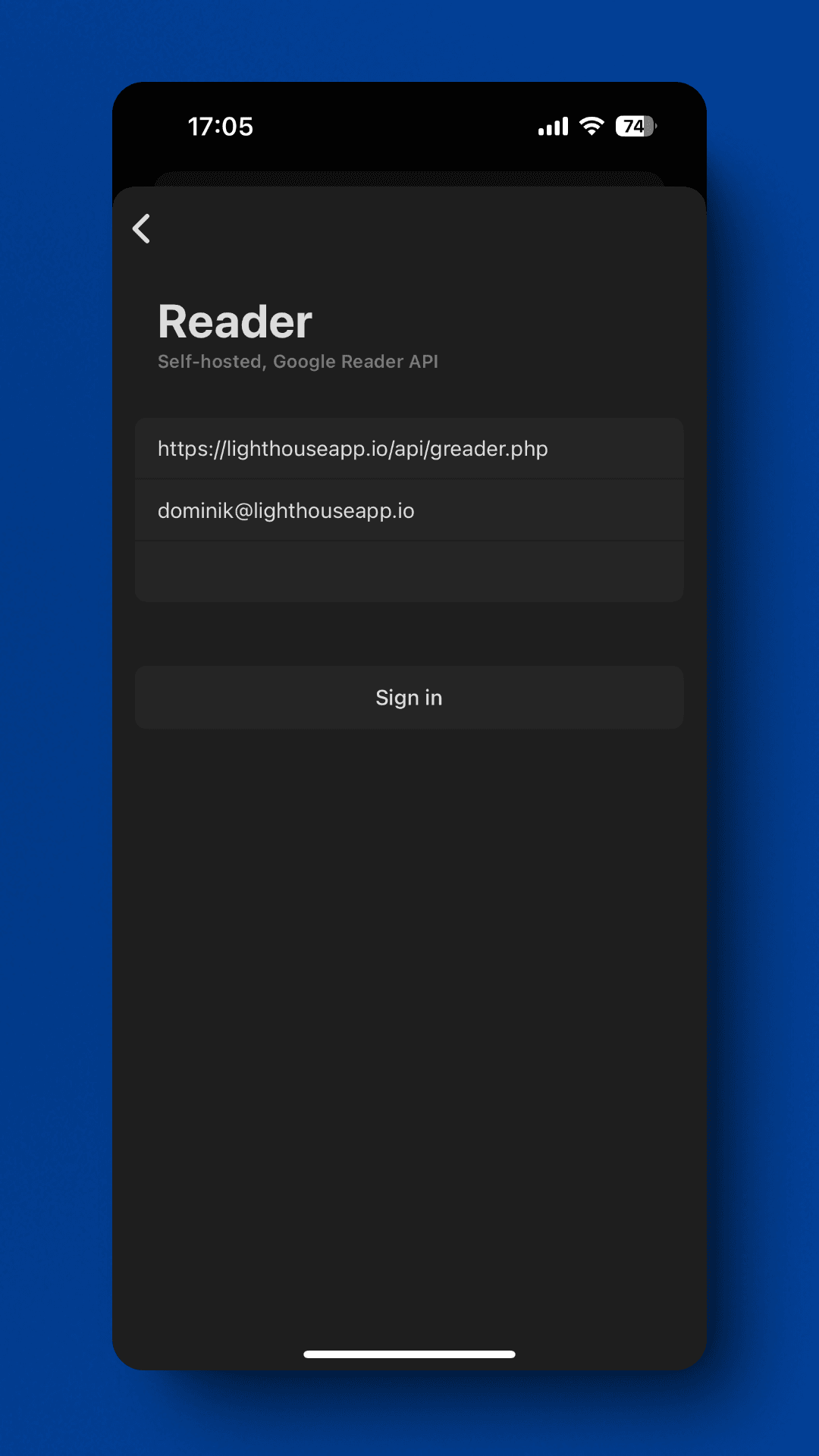 Then go to your reader app and add an account. Reeder 5 has a Reader option and specifically mentions the Google Reader API. If the app you use doesn't have that option, you can also select FreshRSS. Lighthouse' API is compatible with FreshRSS as well.