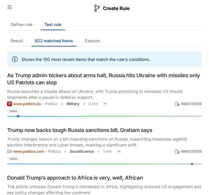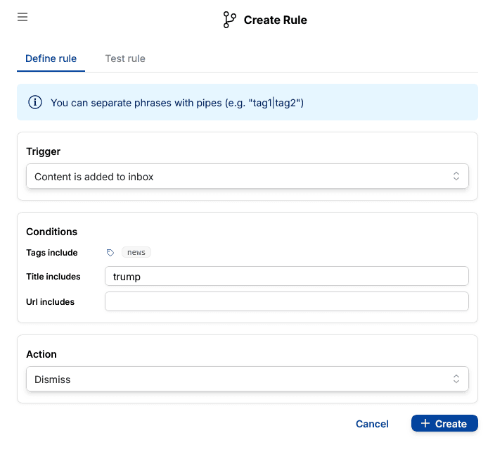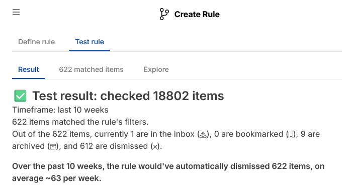 When editing a rule, there's now an additional Test rule tab. In this case I created a rule that automatically dismisses all items tagged with news and have trump in the title.